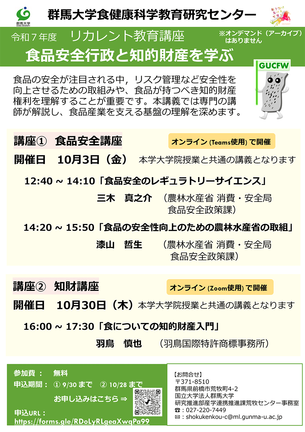 2025年10月3日(金)、30日(木)に令和7年度リカレント教育講座「食品安全行政と知的財産を学ぶ」を開講します。