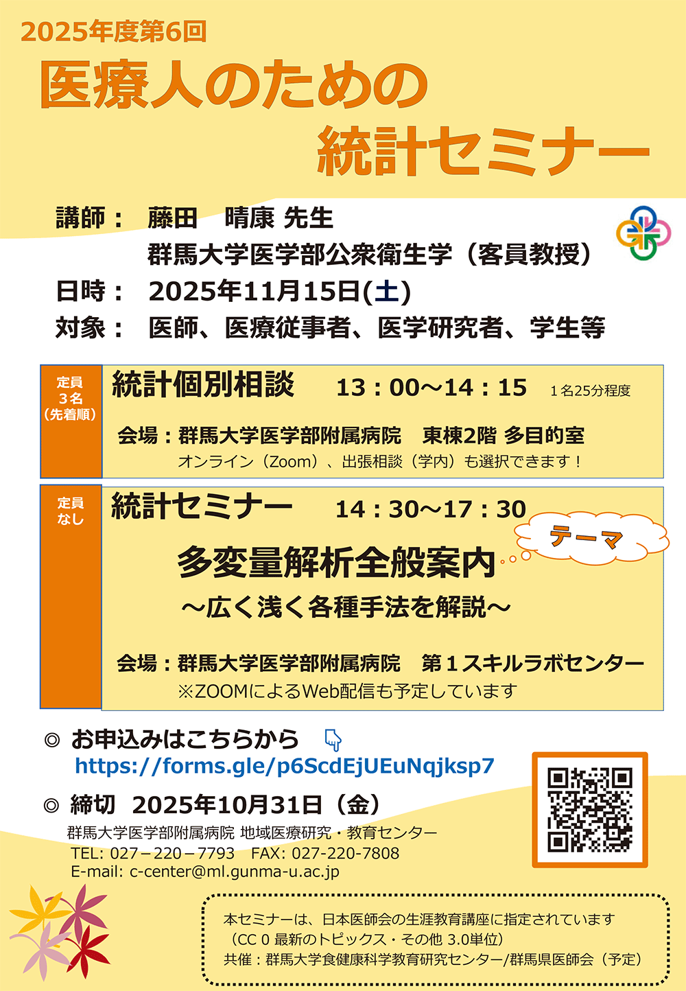 2025年11月15日(土)に医療人のための統計セミナー「多変量解析全般案内~広く浅く各種手法を解説~」を開催します(食健康科学教育研究センター共催)。