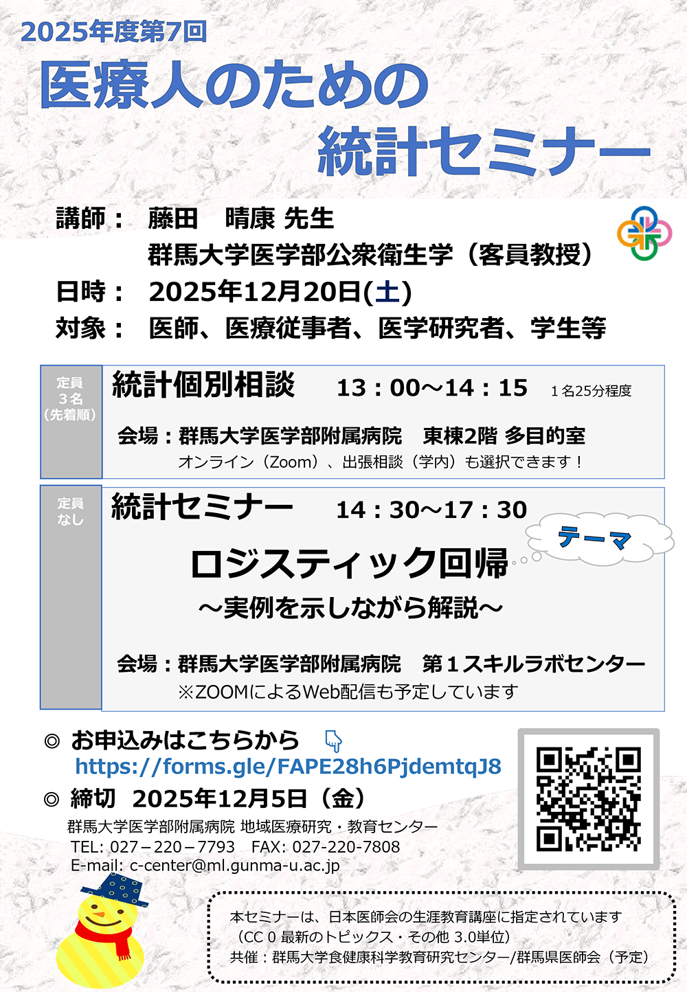 2025年12月20日(土)に医療人のための統計セミナー「ロジスティック回帰~実例を示しながら解説~」を開催します(食健康科学教育研究センター共催)。