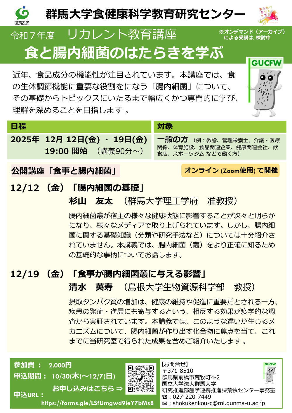 12月12日(金)、19日(金)にリカレント教育講座「食と腸内細菌のはたらきを学ぶ」を開講します!