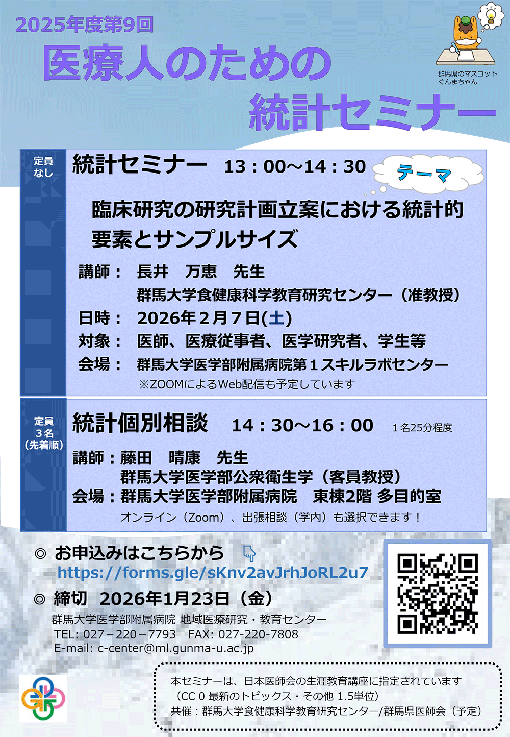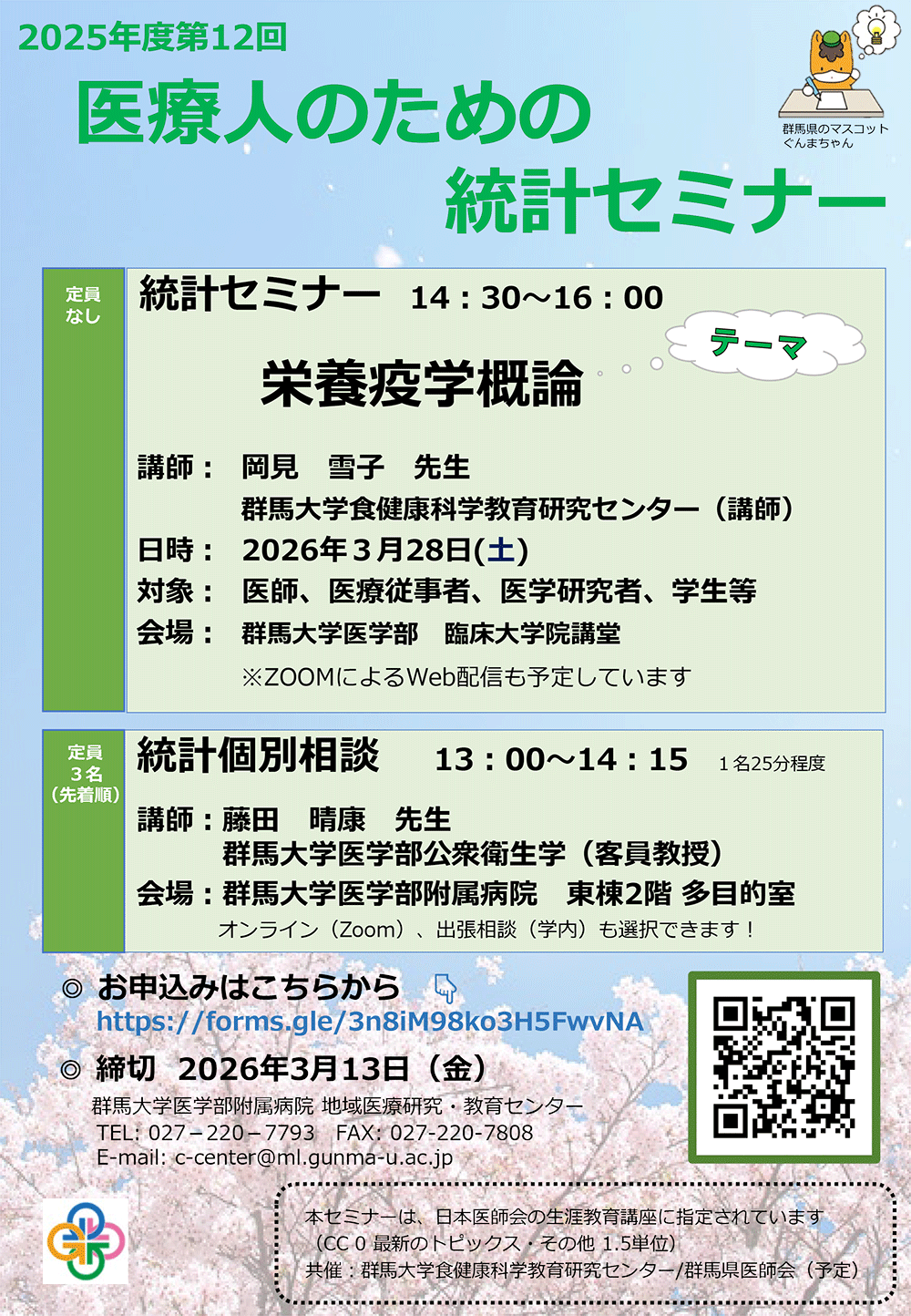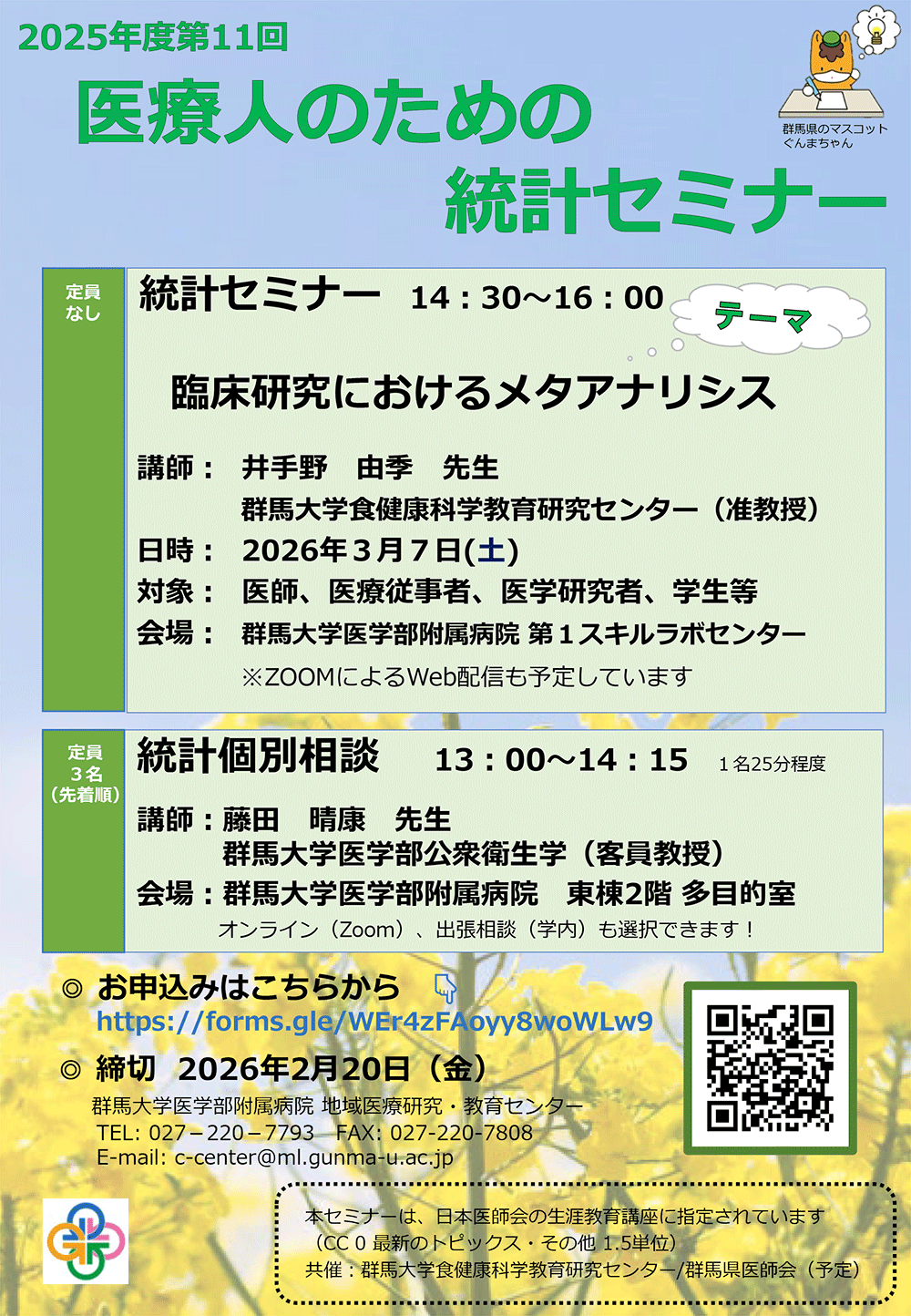 | 問合せ先 | 国立大学法人群馬大学食健康科学教育研究センター事務室 027-220-7633/7634 shokukenkou-c[at]jimu.gunma-u.ac.jp ※[at]を@に変換願います。 |