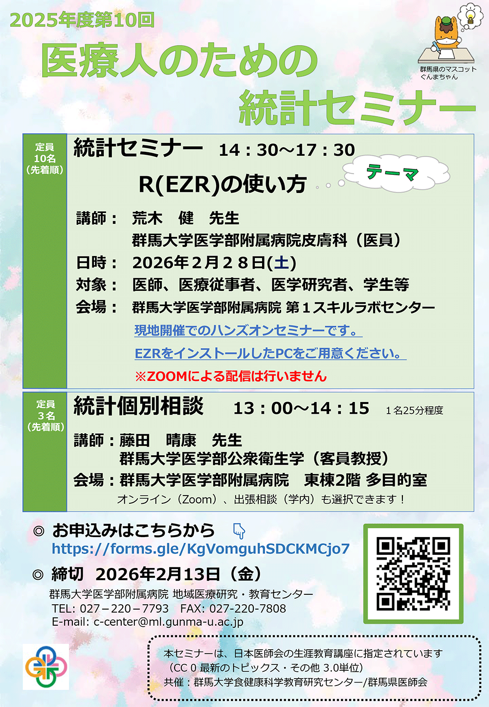 2026年2月28日(土)に医療人のための統計セミナー「R(EZR)の使い方」を開催します(食健康科学教育研究センター共催)。現地開催でのハンズオンセミナーです。