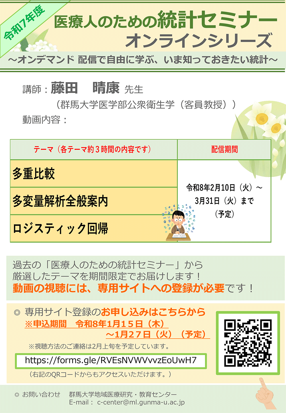 1月6日(火)~27日(火)にリカレント教育講座「生物統計とデータ解析」を開講します!
